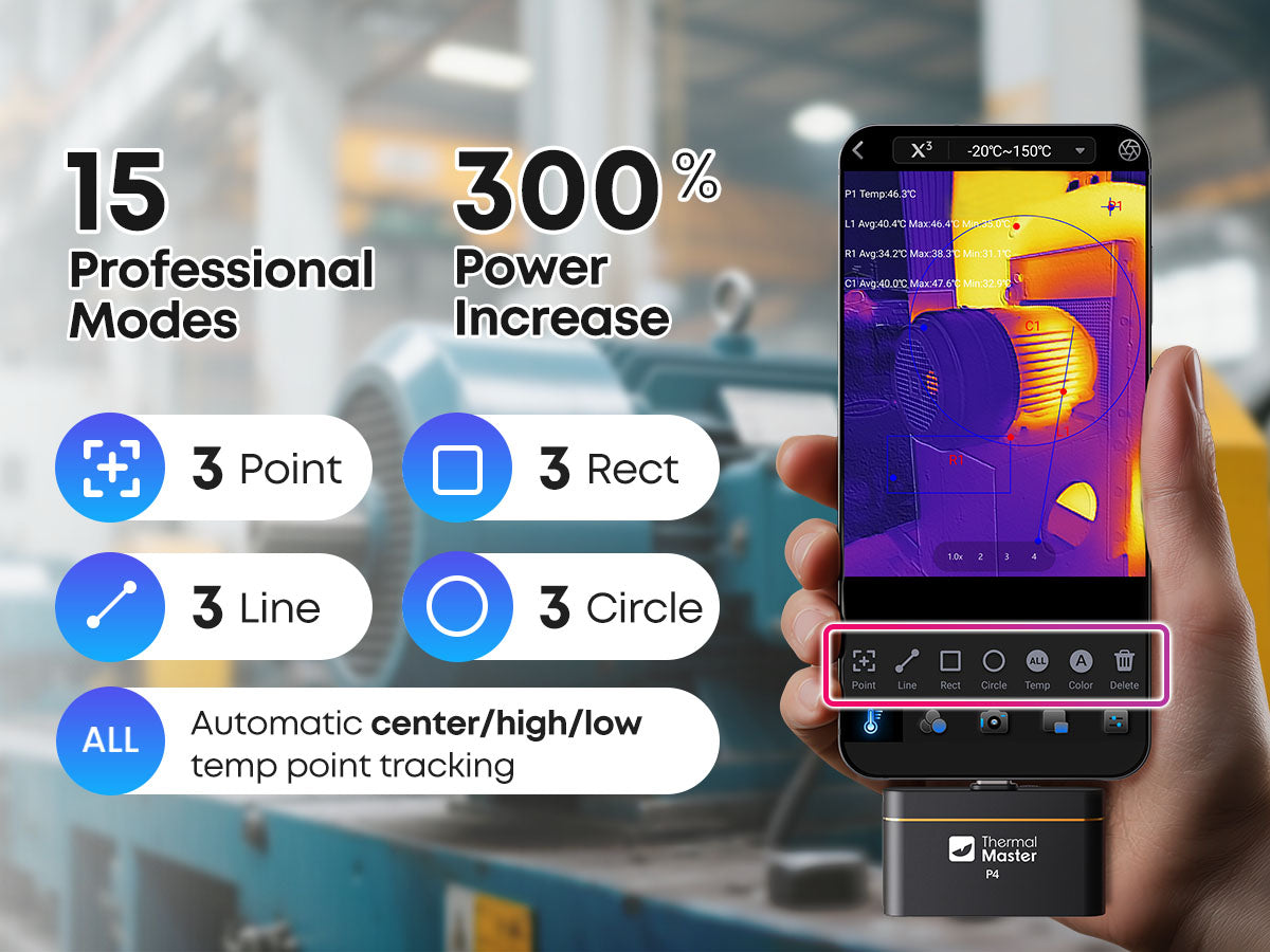 15 measurement modes, including 3 Point, 3 Line, 3 Rect, 3 Circle, and automatic center/high/low temp point tracking, delivering a 300% power increase for versatile thermal inspection.