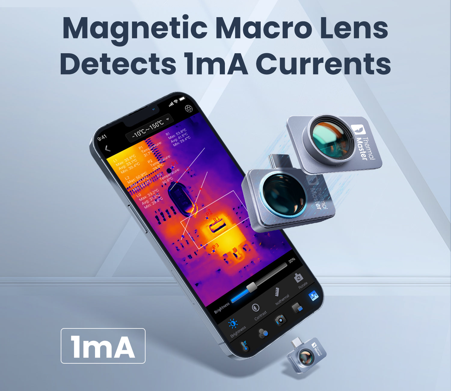 P2 Pro with magnetic macro lens, the phone thermal camera captures 0.25 mm resistors from 4 cm away, with 50+ environment emissivity for precise thermal readings.