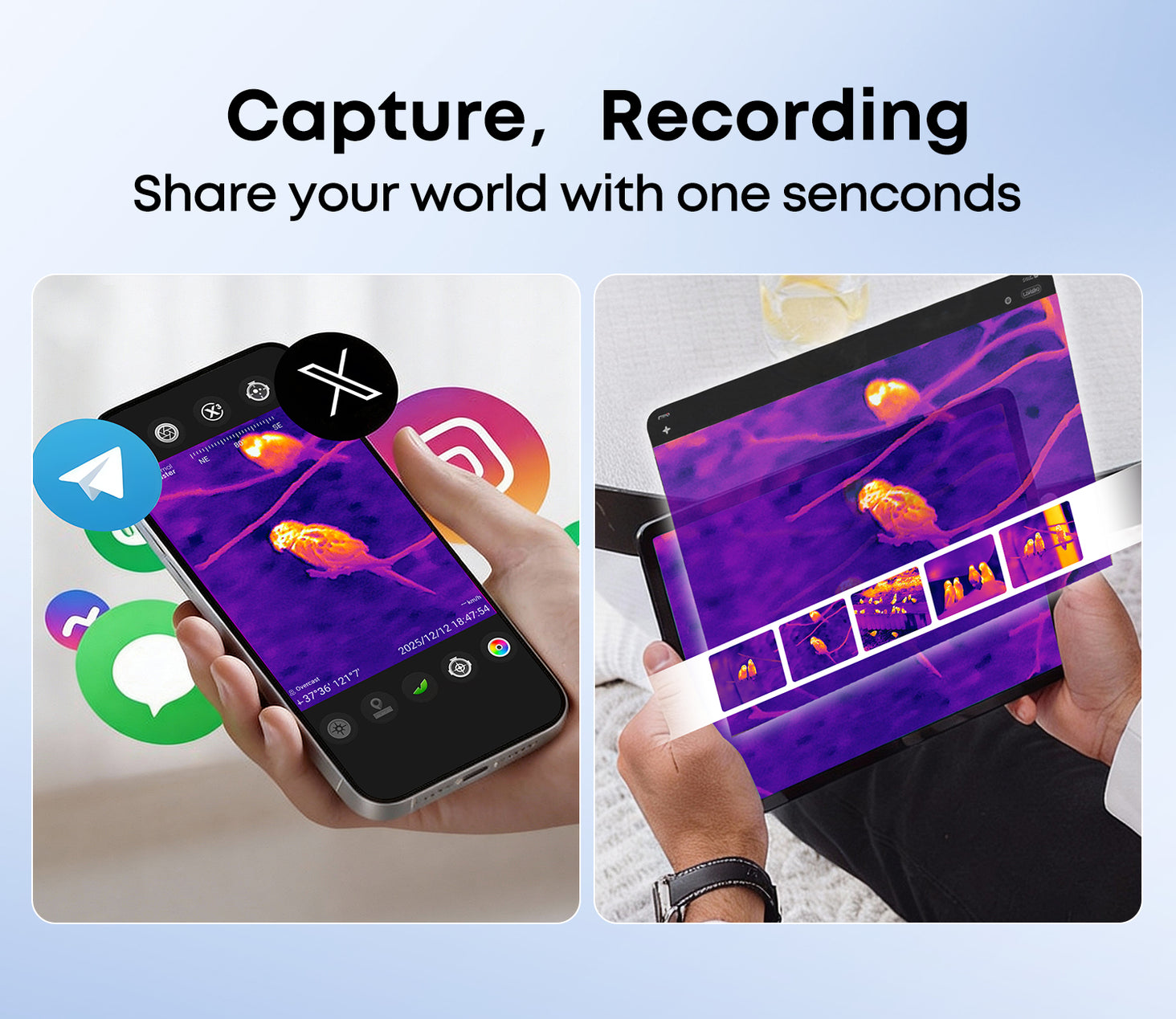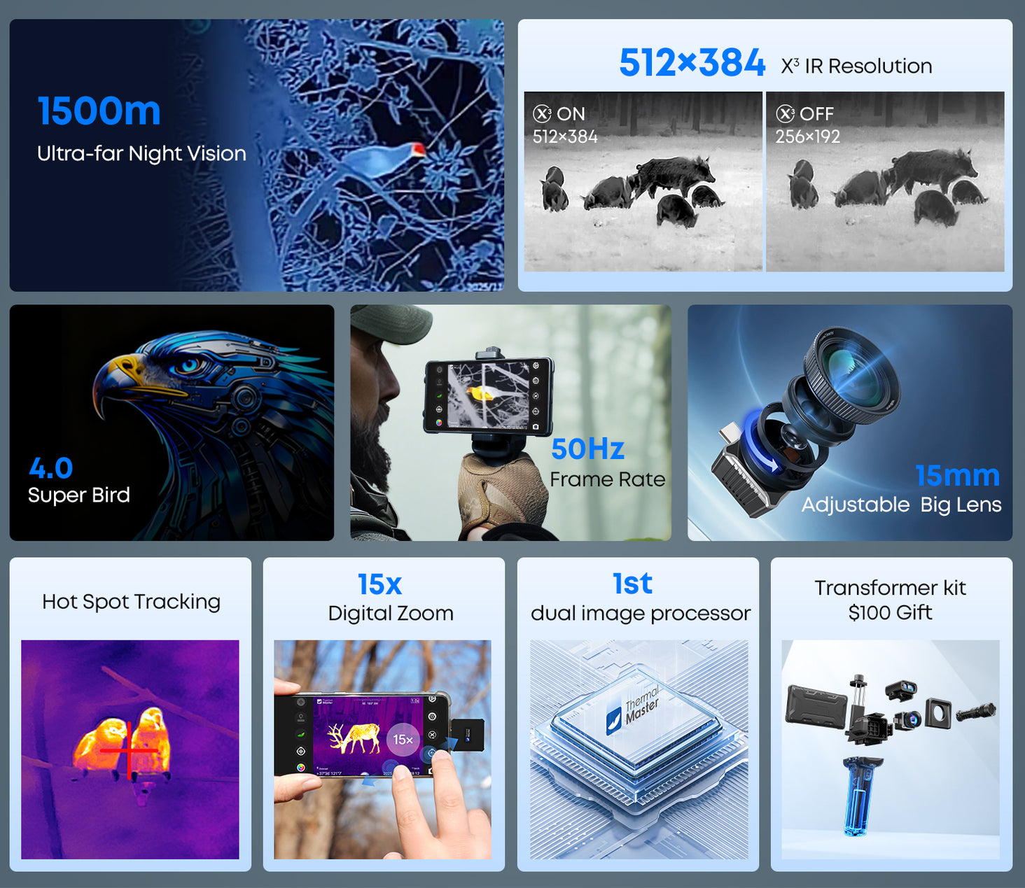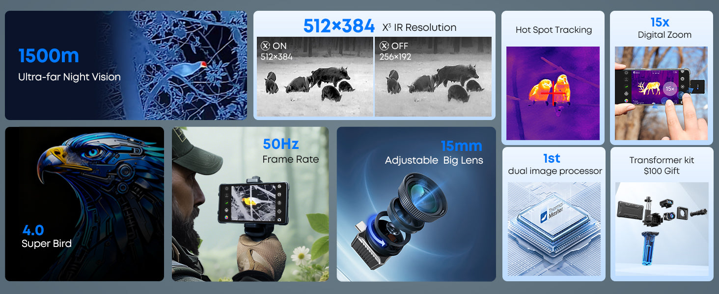 - X³ Super IR Thermal Imaging: 512×384 Super IR resolution with ≤20mK sensitivity, based on a 256×192@12μm high-sensitivity sensor, provides clearer details and accurate detection.