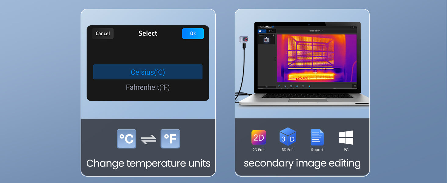 P2 has over 50 environmental parameters, you can adjust the ambient temperature, object distance, and emissivity to read temperatures more accurately.
